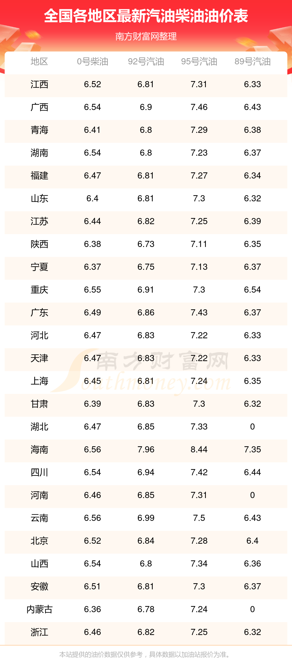 0号柴油平均价格:6元每升,其中,最高为海南,价格6.56元/升,最低为内蒙古,价格6.36元/升。