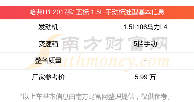 在动力方面,哈弗H1 2017款 蓝标 1.5L 手动标准型搭载的是一台1.5L106马力L4自然吸气发动机,匹配5挡手动挡变速箱,燃料形式为汽油,厂家参考价5.99万元。