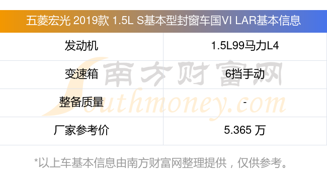 五菱宏光 2019款 1.5L S基本型封窗车国VI LAR动力上配备的是一台1.5L99马力L4自然吸气发动机,匹配的是6挡手动挡变速箱,燃料形式为汽油,厂家参考价5.365万元。