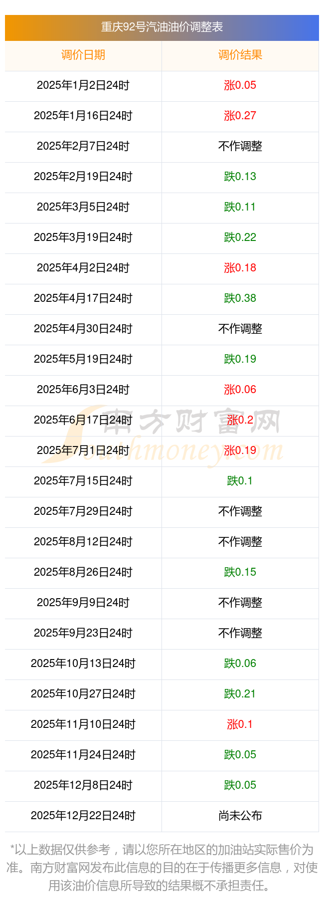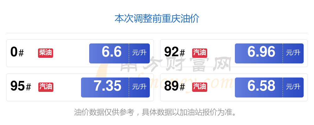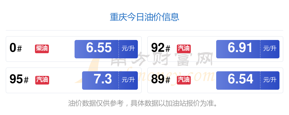 12月14日,重庆汽油、柴油价格的调整时间为12月9日。每升最新价格为:92号汽油为6.91元,下调了0.05元;95号汽油为7.3元,下调了0.05元;89号汽油为6.54元,下调了0.04;0号柴油为6.55元,下调了0.05元。