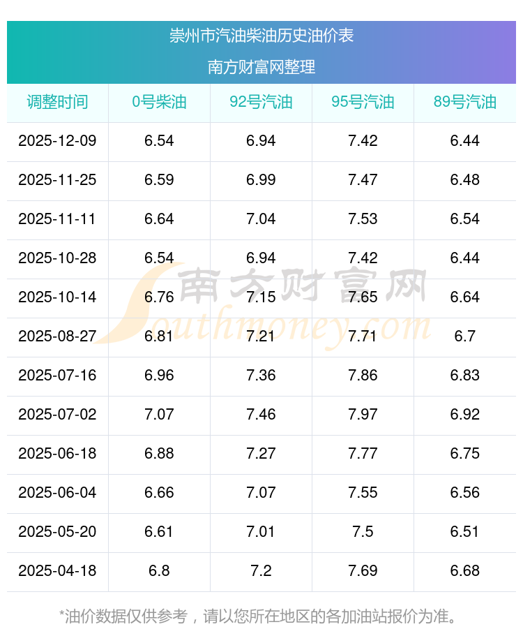 油价调整最新消息:下一轮油价调整时间12月22日24时。崇州市汽油、柴油12月14日每升最新价格为:0号柴油为6.54元,减了0.05元;95号汽油为7.42元;92号汽油为6.94元;89号汽油为6.44元,调整时间为12月9日。