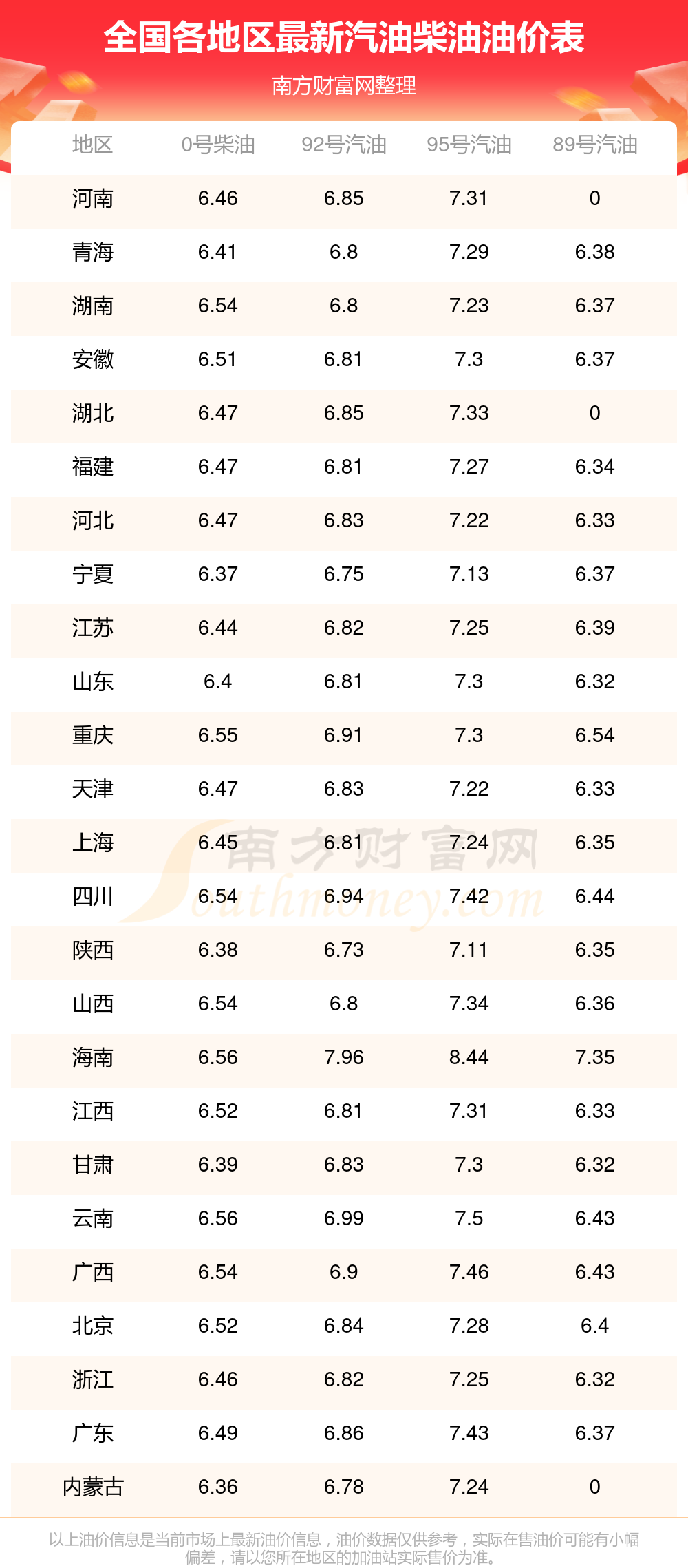 以上油价信息是当前市场上最新油价信息,油价数据仅供参考,实际在售油价可能有小幅偏差,请以您所在地区的加油站实际售价为准。