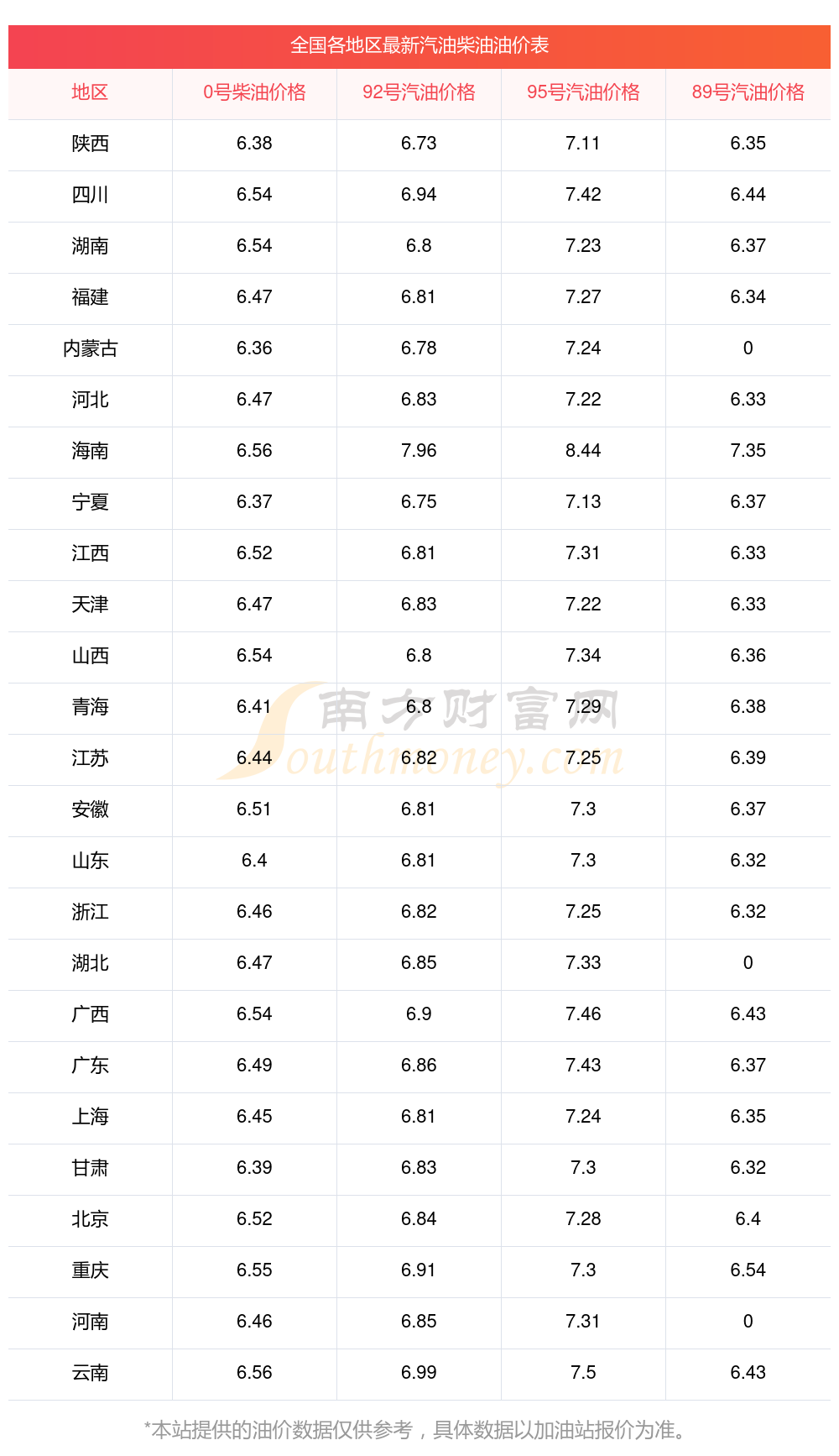 以上数据仅供参考,请以您所在地区的加油站实际售价为准。南方财富网发布此信息的目的在于传播更多信息,对使用该油价信息所导致的结果概不承担责任。