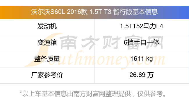 沃尔沃S60L 2016款 1.5T T3 智行版动力方面,搭载的是一台1.5T152马力L4涡轮增压发动机,匹配6挡手自一体自动档变速箱,燃料形式为汽油,常规整备质量1611kg,厂家参考价26.69万元。