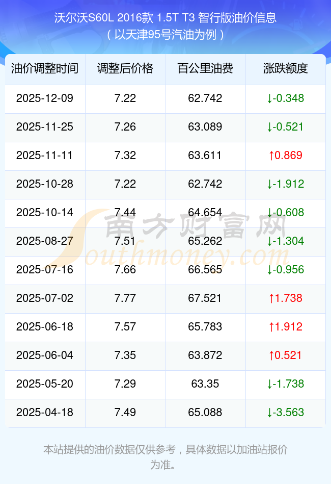 根据12月9日95号汽油最新调整价格7.22元/升来计算(以天津为例),该车型每百公里的平均油费是62.742元,上一轮11月25日调整价格7.26元每升来计算,每百公里的平均油费是63.089元,对比上一轮少花0.348元,下一轮的油价调整时间是12月22日24时。