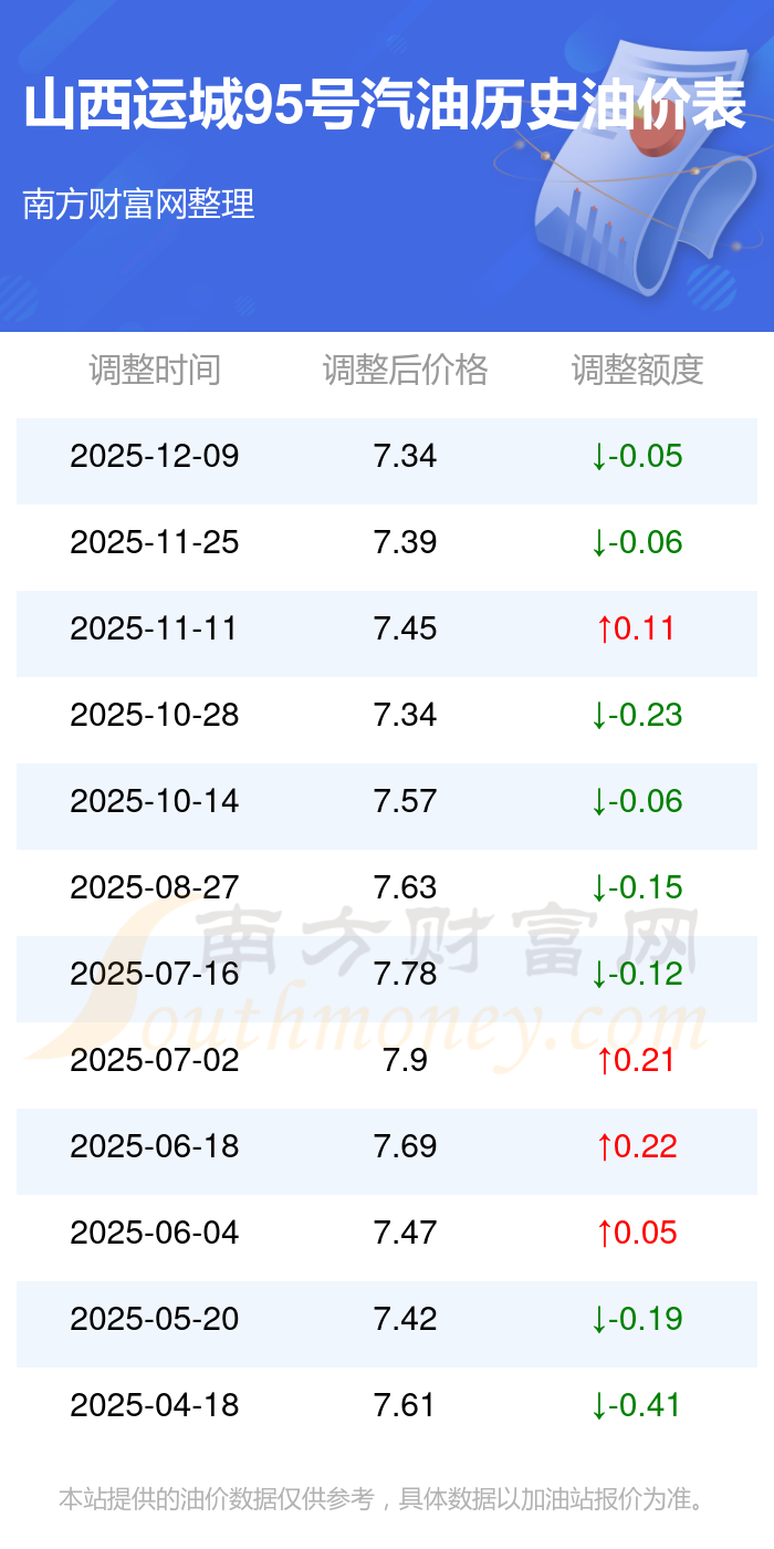 12月14日山西运城95号汽油的价格为7.34元/升,本轮油价的调整时间为12月9日,相对上一轮油价调整时间11月25日的价格7.39元/升,下降了0.05元,下降幅达0.677%。下一轮油价调整时间12月22日24时,距离现在还有8.59天。