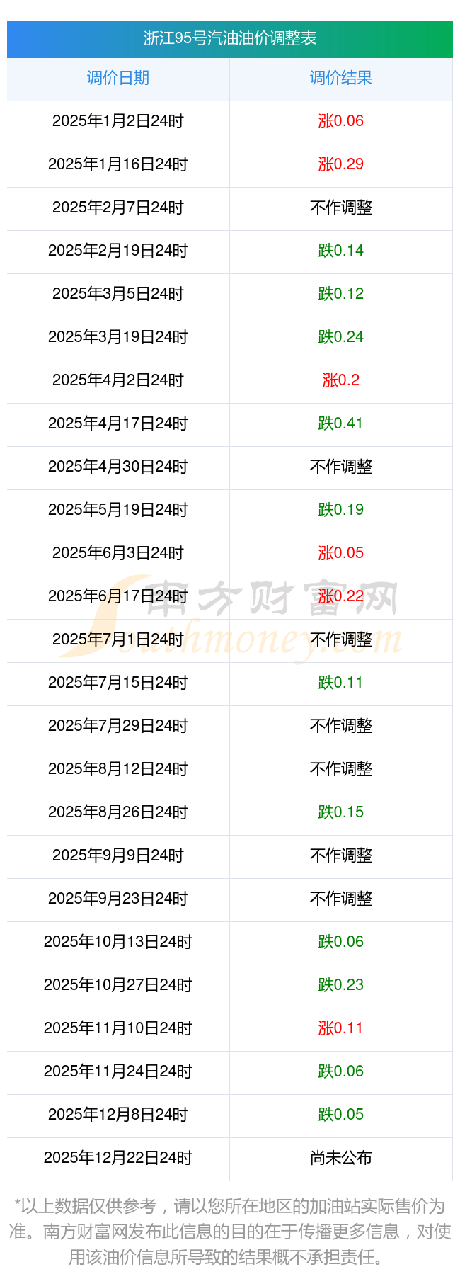 12月14日浙江汽油、柴油每升的价格具体为:本轮油价调整时间为12月9日,92号汽油是6.82元,下调了0.04元,下调幅达0.58%;95号汽油是7.25元,下调了0.05元,下调幅达0.69%;89号汽油为6.32元,下调了0.04元,下调幅达0.63%;0号柴油为6.46元,下调了0.05元,下调幅达0.77%。