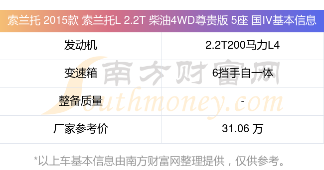 索兰托 2015款 索兰托L 2.2T 柴油4WD尊贵版 5座 国IV动力上配备的是一台2.2T200马力L4涡轮增压发动机,匹配的是6挡手自一体自动档变速箱,燃料形式为柴油,厂家参考价31.06万元。