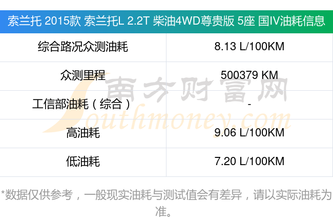 根据多位车主实测得出数据,该车型低油耗为7.20L/100km,高油耗为9.06L/100km,综合路况众测油耗为8.13L/100km,工信部综合油耗为-L/100km。