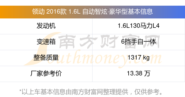 在动力方面,领动 2016款 1.6L 自动智炫·豪华型搭载的是一台1.6L130马力L4自然吸气发动机,匹配6挡手自一体自动档变速箱,燃料形式为汽油,常规整备质量1317kg,厂家参考价13.38万元。