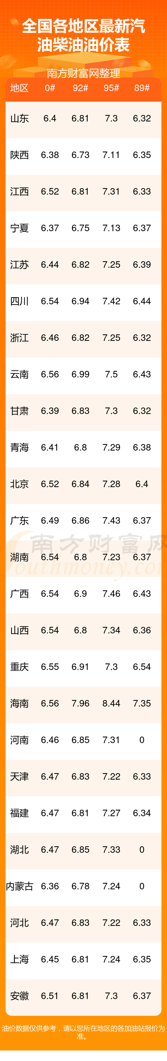 全国89号汽油平均价格为:6元每升,其中,最低为浙江,价格6.32元/升,最高为海南,价格7.35元/升。
