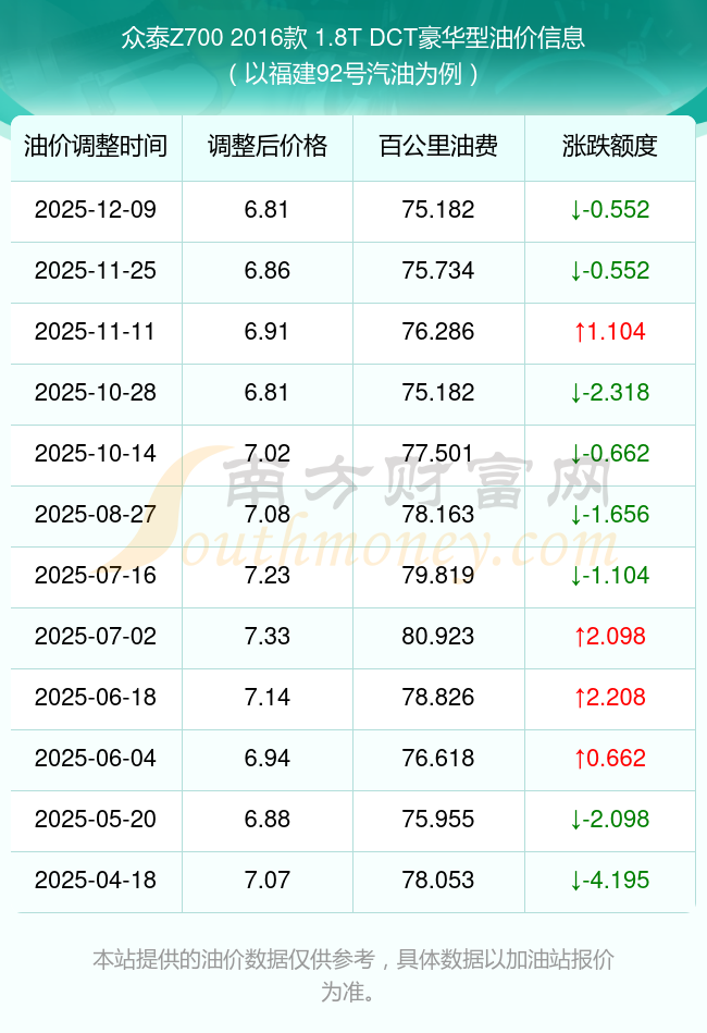 按12月9日92号汽油最新调整价格6.81元每升来计算(以福建为例),该车型百公里平均油费为75.182元,按上一轮11月25日调整价格6.86元每升来计算,百公里平均油费为75.734元,对比上一轮少花0.552元,下一轮油价调整时间为12月22日24时。