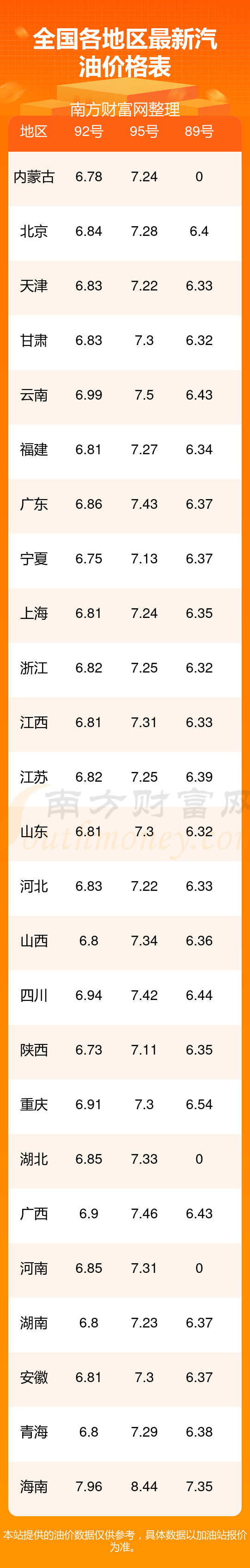 油价数据仅供参考,请以您所在地区的加油站报价为准。南方财富网发布此信息的目的在于传播更多信息,对使用该油价信息所导致的结果概不承担任何责任。