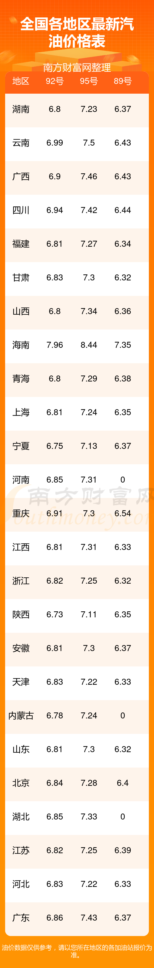 2025年12月14日全国各地油价调整及最新汽油价格表