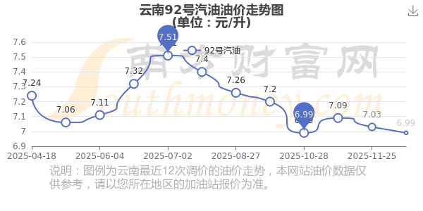 油价调整最新消息:12月14日云南汽油、柴油最新价格:本次油价调整时间是12月9日,92号汽油6.99元,下降了0.04元,下降幅达0.57%;95号汽油7.5元,下降了0.05元,下降幅达0.66%;89号汽油6.43元,下降了0.05元,下降幅达0.77%;0号柴油6.56元,下降了0.04元,下降幅达0.61%。下一轮油价调整时间12月22日24时。
