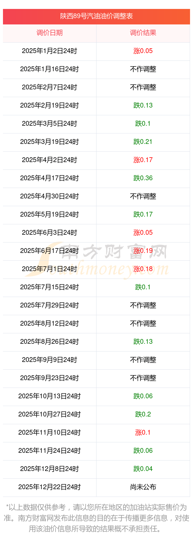 12月14日,陕西西安汽油、柴油每升最新价格为:92号汽油为6.73元,减了0.05元;95号汽油为7.11元,减了0.05元;89号汽油为6.35元,减了0.04元;0号柴油为6.38元,减了0.05元,调整时间为12月9日。