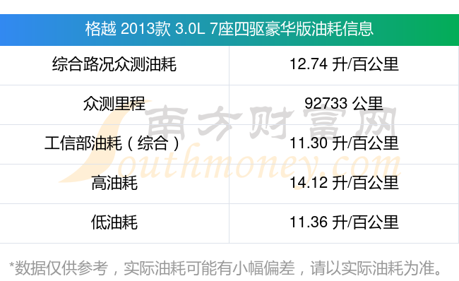 根据车主实测数据,该车型低油耗为11.36L/100km,高油耗为14.12L/100km,综合路况众测油耗为12.74L/100km,工信部综合油耗为11.30L/100km。