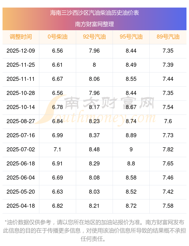油价调整最新消息:下一轮油价调整时间12月22日24时。海南三沙西沙区汽油、柴油12月14日每升最新价格为:92号汽油为7.96元;95号汽油为8.44元;89号汽油为7.35元;0号柴油为6.56元,调整时间为12月9日。
