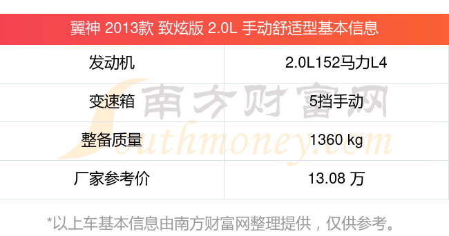 翼神 2013款 致炫版 2.0L 手动舒适型搭载了一台2.0L152马力L4自然吸气发动机,采用5挡手动挡变速箱,常规整备质量1360kg,厂家参考价13.08万元。