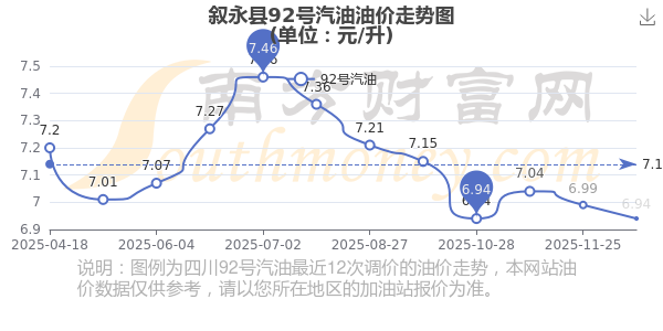 叙永县汽油、柴油12月14日每升的价格为12月9日调整后的价格,具体油价为:92号汽油6.94元;95号汽油7.42元;89号汽油6.44元;0号柴油6.54元。