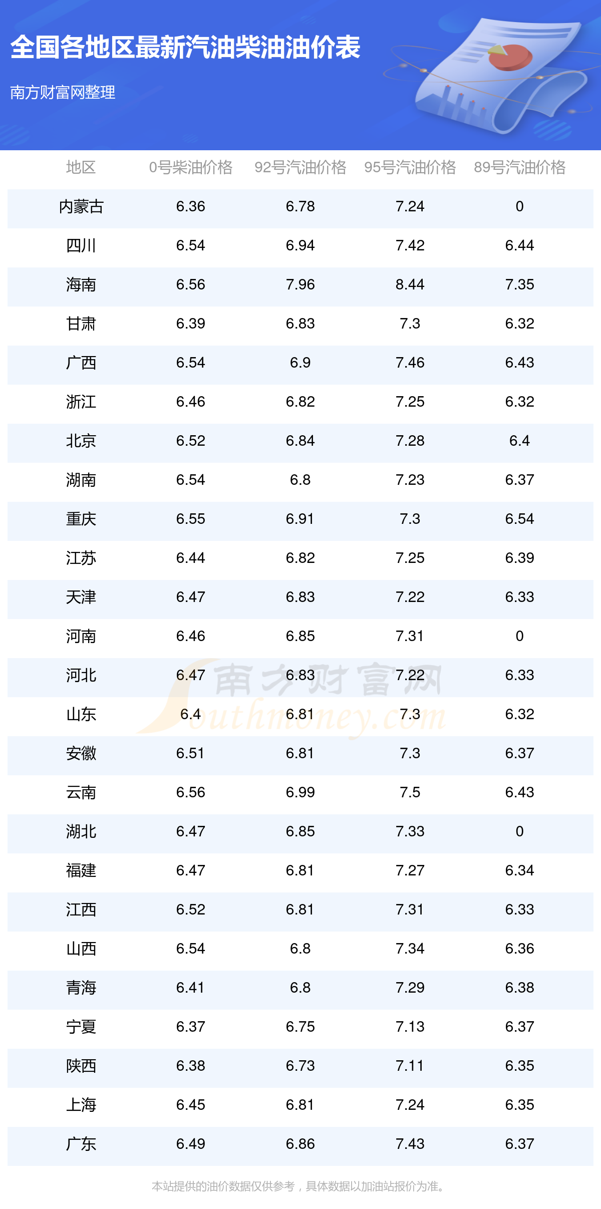 油价数据仅供参考,请以您所在地区的加油站报价为准。南方财富网发布此信息的目的在于传播更多信息,对使用该油价信息所导致的结果概不承担任何责任。