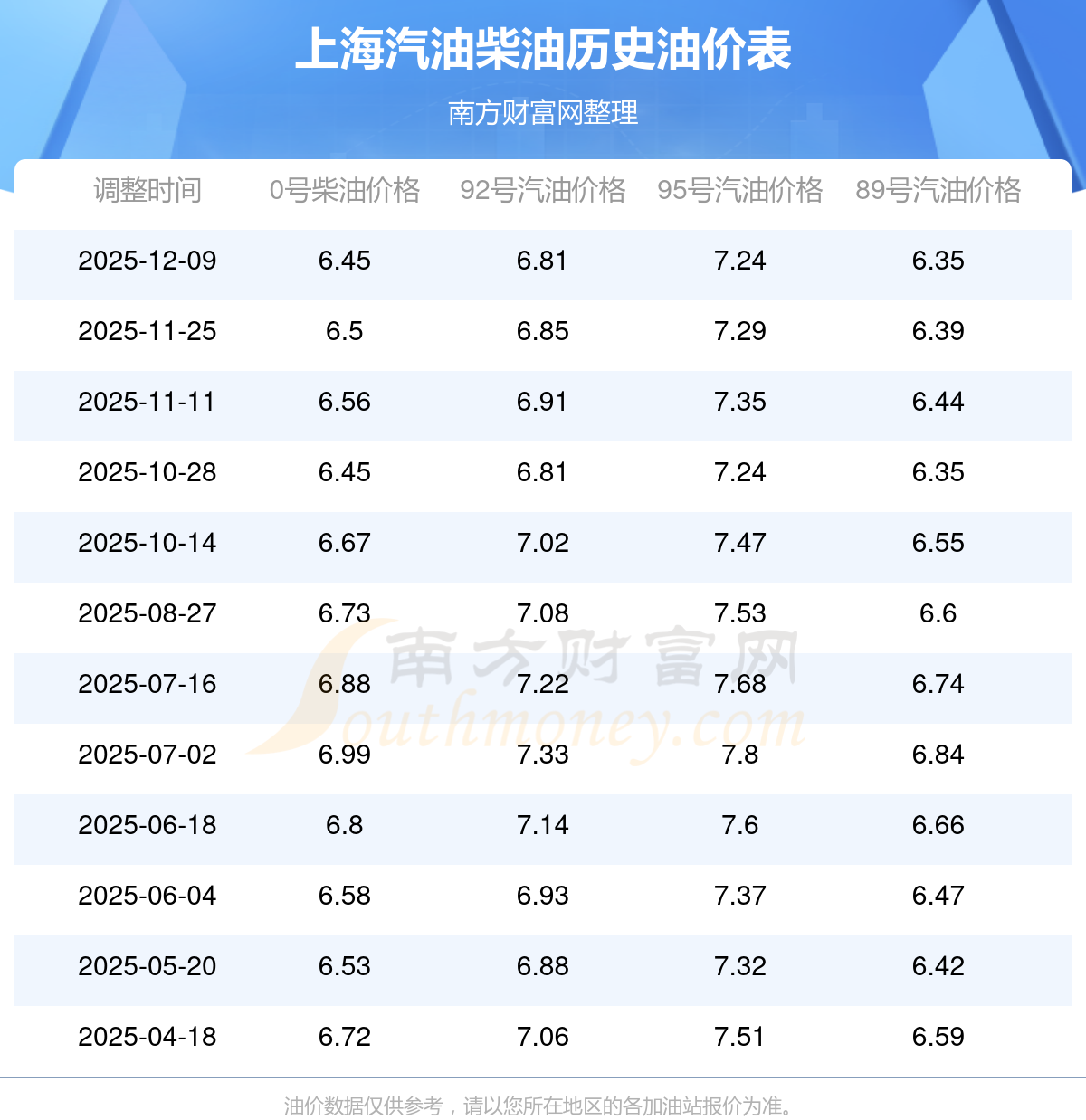 12月14日上海汽油、柴油的最新价格是12月9日调整后的价格,具体为92号汽油6.81元,减了0.04元,减幅达0.58%;95号汽油7.24元,减了0.05元,减幅达0.69%;89号汽油6.35元,减了0.04元,减幅达0.63%;0号柴油6.45元,减了0.05元,减幅达0.77%。