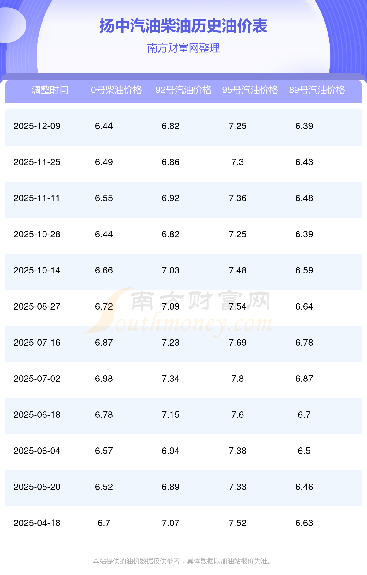 扬中汽油、柴油12月14日每升的价格为:92号汽油6.82元;95号汽油7.25元;89号汽油6.39元;0号柴油6.44元,本次油价调整时间是12月9日。