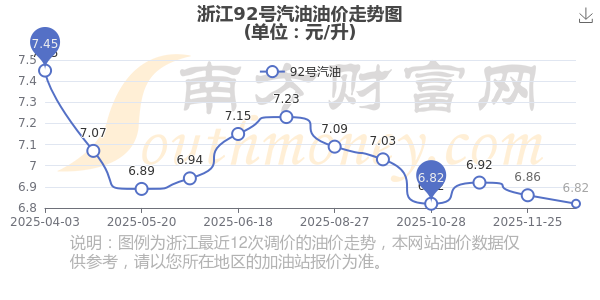 汽油价格调整最新消息:下一轮油价调整时间12月22日24时。浙江汽油、柴油12月14日每升最新价格为12月9日调整后的价格,92号汽油为6.82元,跌了0.04元;95号汽油为7.25元,跌了0.05元;89号汽油为6.32元,跌了0.04;0号柴油为6.46元,跌了0.05元。