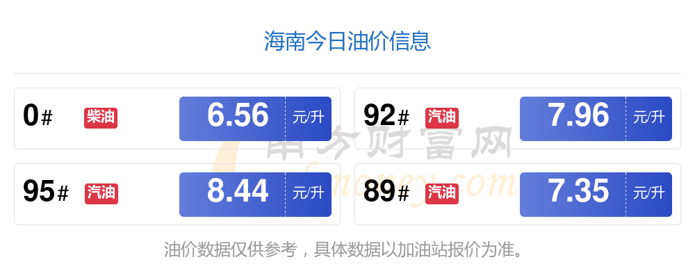 海南儋州汽油、柴油12月14日每升的价格为12月9日调整后的价格:92号汽油7.96元;95号汽油8.44元;89号汽油7.35元;0号柴油6.56元。海南儋州下一轮油价调整时间12月22日24时,距离现在还有8.52天。
