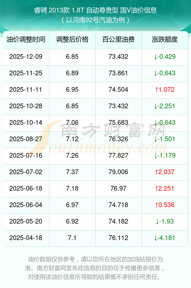 依照12月9日92号汽油最新调整价格6.85元/升来计算(以河南为例),该车型百公里的平均油费是73.432元,依照上一轮11月25日调整价格6.89元/升来计算,百公里的平均油费是73.861元,对比上一轮少花0.429元,下一轮的油价调整时间12月22日24时。