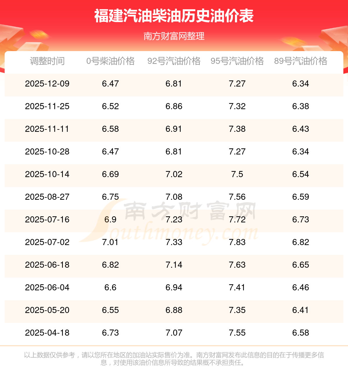 12月14日,福建0号柴油的价格是6.47元每升,本次的调整时间为12月9日,对比上次的调整下降了0.05元,下降0.767%,12月22日24时为下一轮油价调整时间,还有8.51天。