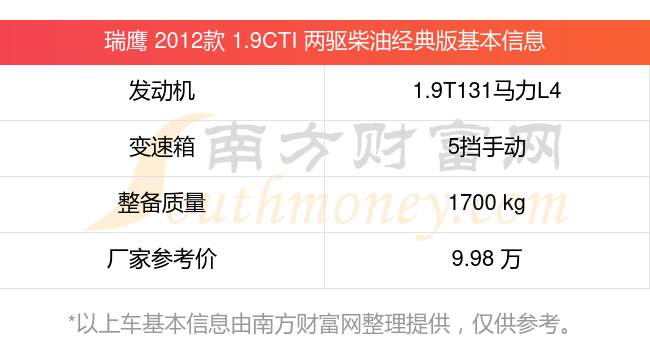 瑞鹰 2012款 1.9CTI 两驱柴油经典版动力方面,搭载的是一台1.9T131马力L4涡轮增压发动机,匹配5挡手动挡变速箱,燃料形式为柴油,常规整备质量1700kg,厂家参考价9.98万元。