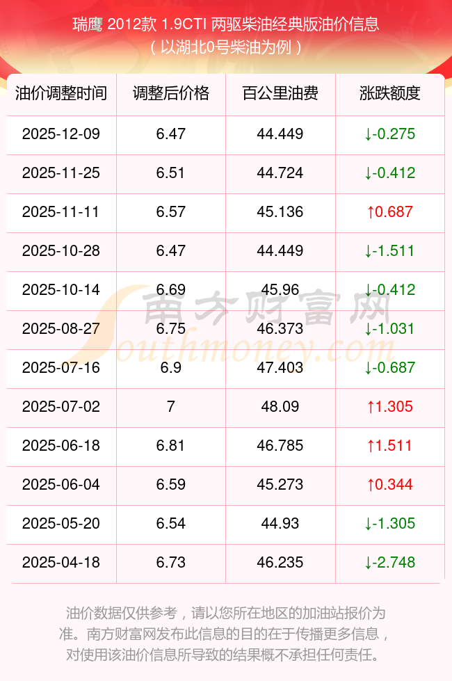 按12月9日0号柴油最新调整价格6.47元每升来计算(以湖北为例),该车型百公里平均油费为44.449元,按上一轮11月25日调整价格6.51元每升来计算,百公里平均油费为44.724元,对比上一轮少花0.275元,下一轮油价调整时间为12月22日24时。