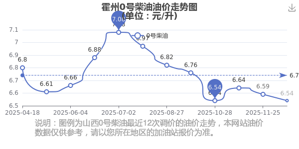 油价调整最新消息:霍州汽油、柴油12月14日每升最新价格为:92号汽油为6.8元;95号汽油为7.34元;89号汽油为6.36元;0号柴油为6.54元,调整时间为12月9日。霍州下一轮油价调整时间12月22日24时,距离现在还有8.5天。
