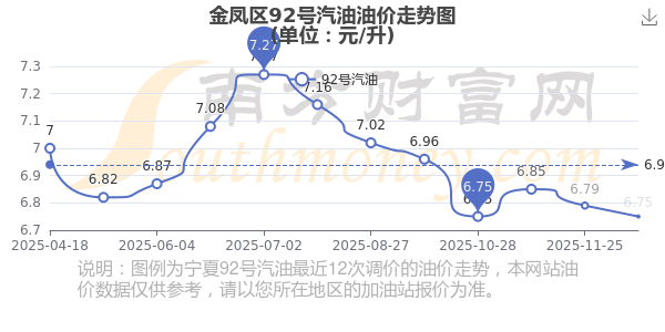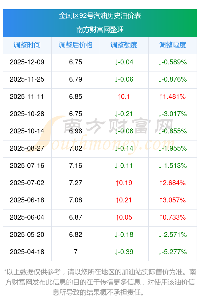 12月14日,金凤区92号汽油的价格为6.75元/升,这是12月9日油价调整后的价格,对比上一轮油价调整时间11月25日的价格6.79元每升,下降了0.04元,下降幅达0.589%。