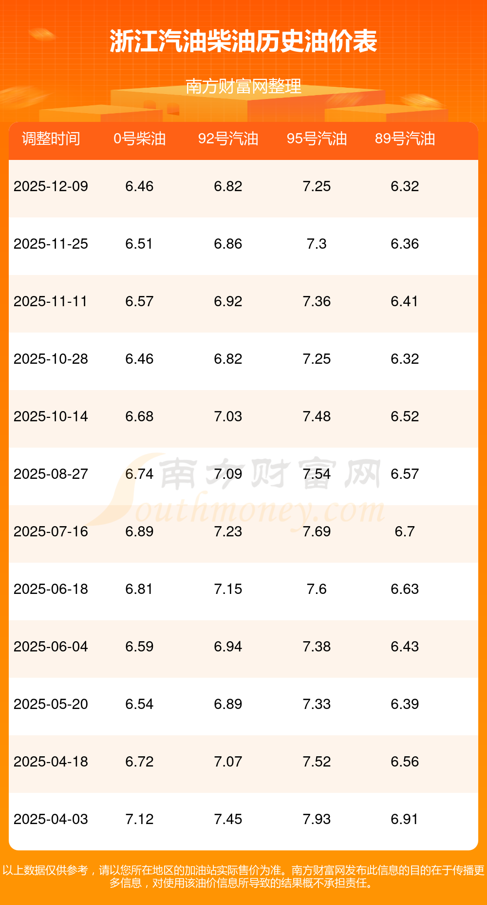 12月14日,浙江92号汽油的价格是6.82元每升,本次的调整时间为12月9日,对比上次的调整跌了0.04元,跌0.583%,下次调整时间为12月22日24时,还有8.5天。