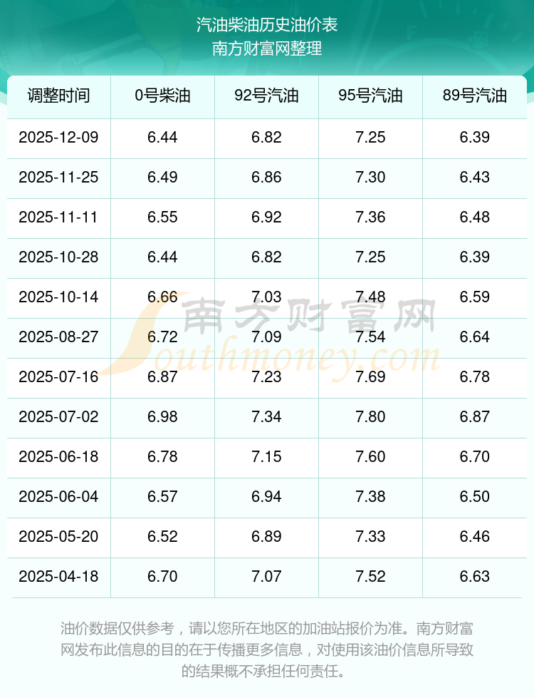 12月14日江苏泰州92号汽油的最新价格(12月9日调整后的价格):6.82元/升,相对上次调整减了0.04元。下一轮油价调整时间12月22日24时,距离现在还有8.5天。