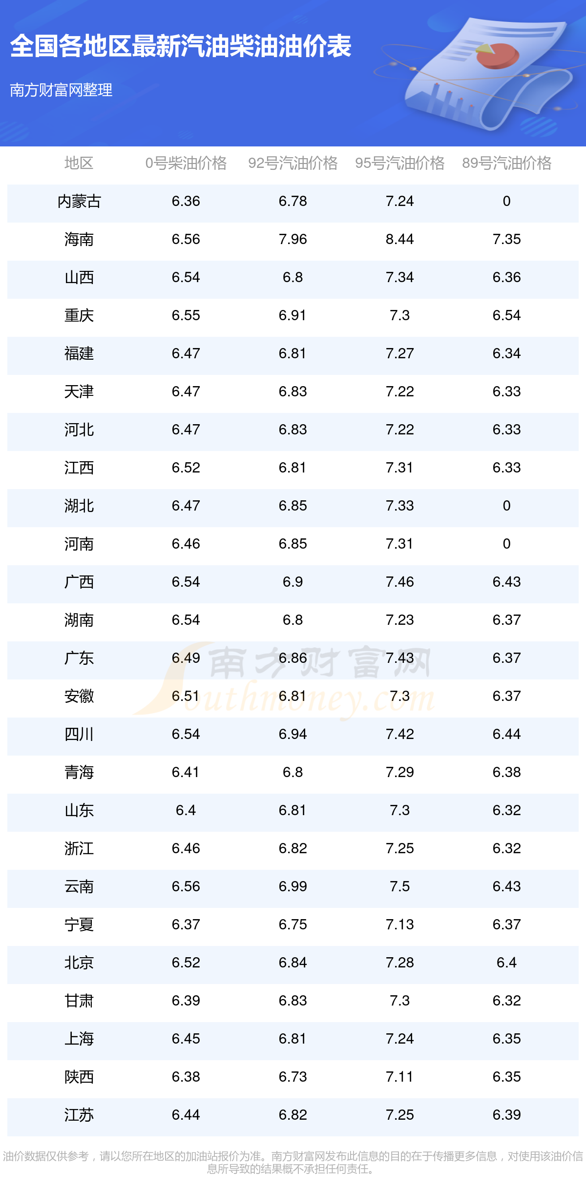 以上数据仅供参考,请以您所在地区的加油站实际售价为准。南方财富网发布此信息的目的在于传播更多信息,对使用该油价信息所导致的结果概不承担责任。