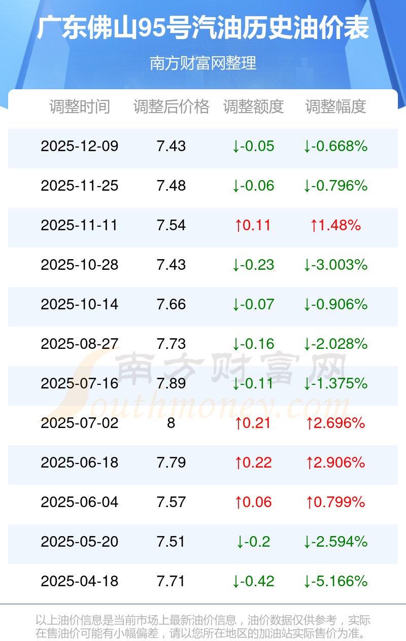 广东佛山95号汽油12月14日价格(12月9日调整后的价格):7.43元每升,对比上次调整(11月25日)的价格7.48元每升下降了0.05元,下降幅达0.668%。下一轮油价调整时间12月22日24时,距离现在还有8.48天。