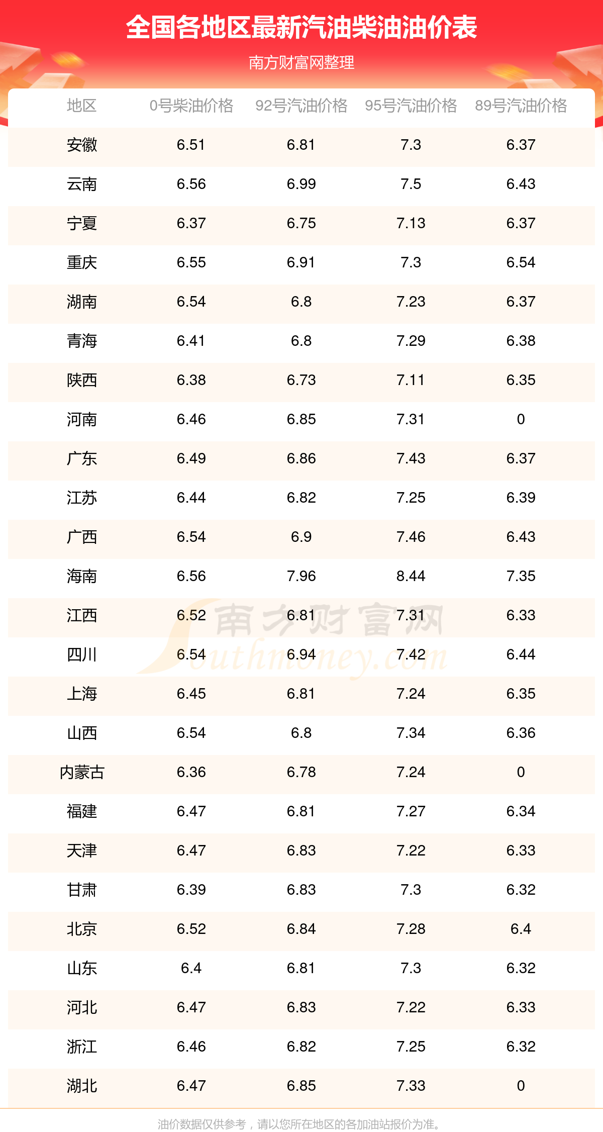 全国各地区2025年最新油价表