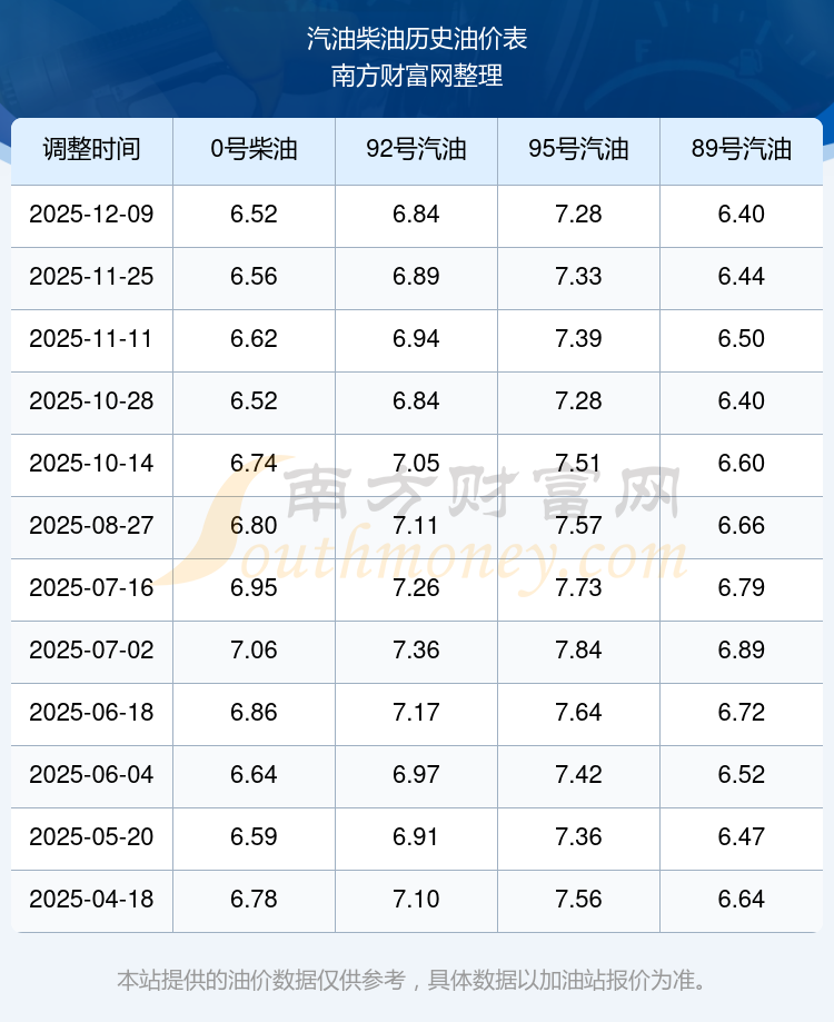 2025年95号汽油价格一览表