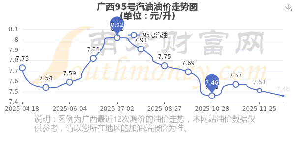 汽油价格调整最新消息:下一轮油价调整时间12月22日24时。12月14日广西汽油、柴油每升的价格具体为:本轮油价调整时间为12月9日,92号汽油是6.9元,下降了0.05元,下降幅达0.72%;95号汽油是7.46元,下降了0.05元,下降幅达0.67%;89号汽油为6.43元,下降了0.04元,下降幅达0.62%;0号柴油为6.54元,下降了0.04元,下降幅达0.61%。