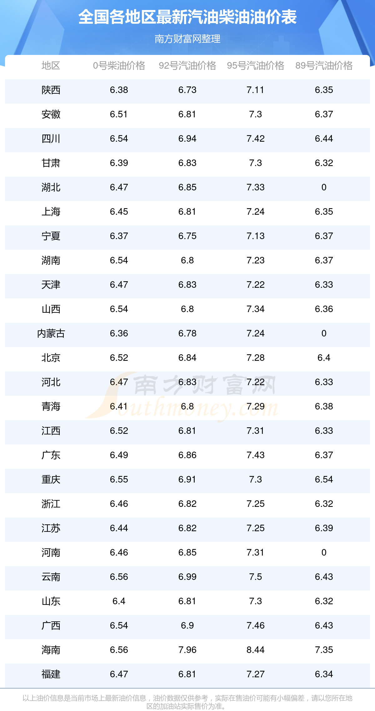 油价数据仅供参考,请以您所在地区的加油站报价为准。南方财富网发布此信息的目的在于传播更多信息,对使用该油价信息所导致的结果概不承担任何责任。