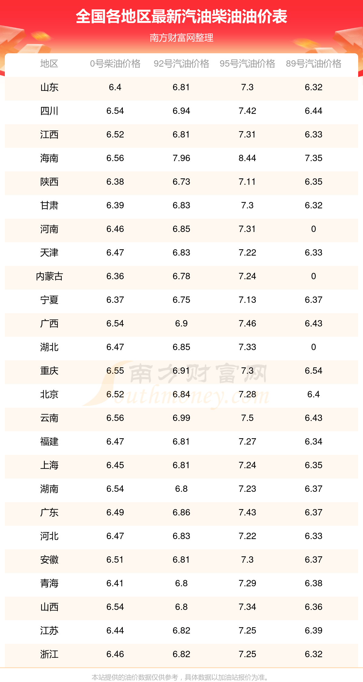 油价数据仅供参考,请以您所在地区的加油站报价为准。南方财富网发布此信息的目的在于传播更多信息,对使用该油价信息所导致的结果概不承担任何责任。