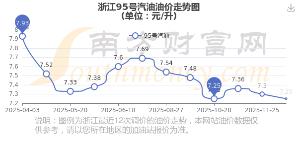 12月14日,浙江95号汽油的价格是7.25元每升,本次的调整时间为12月9日,对比上次的调整降了0.05元,降0.685%,下次调整时间为12月22日24时,还有8.39天。