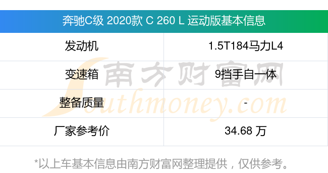 奔驰C级 2020款 C 260 L 运动版搭载了一台1.5T184马力L4涡轮增压发动机,采用9挡手自一体自动档变速箱,厂家参考价34.68万元。