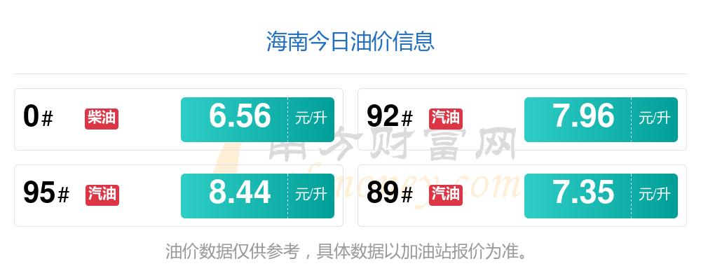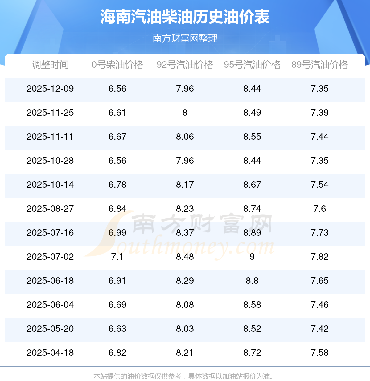 汽油价格调整最新消息:下一轮油价调整时间12月22日24时。12月14日,海南汽油、柴油价格的调整时间为12月9日。每升最新价格为:92号汽油为7.96元,减了0.04元;95号汽油为8.44元,减了0.05元;89号汽油为7.35元,减了0.04;0号柴油为6.56元,减了0.05元。