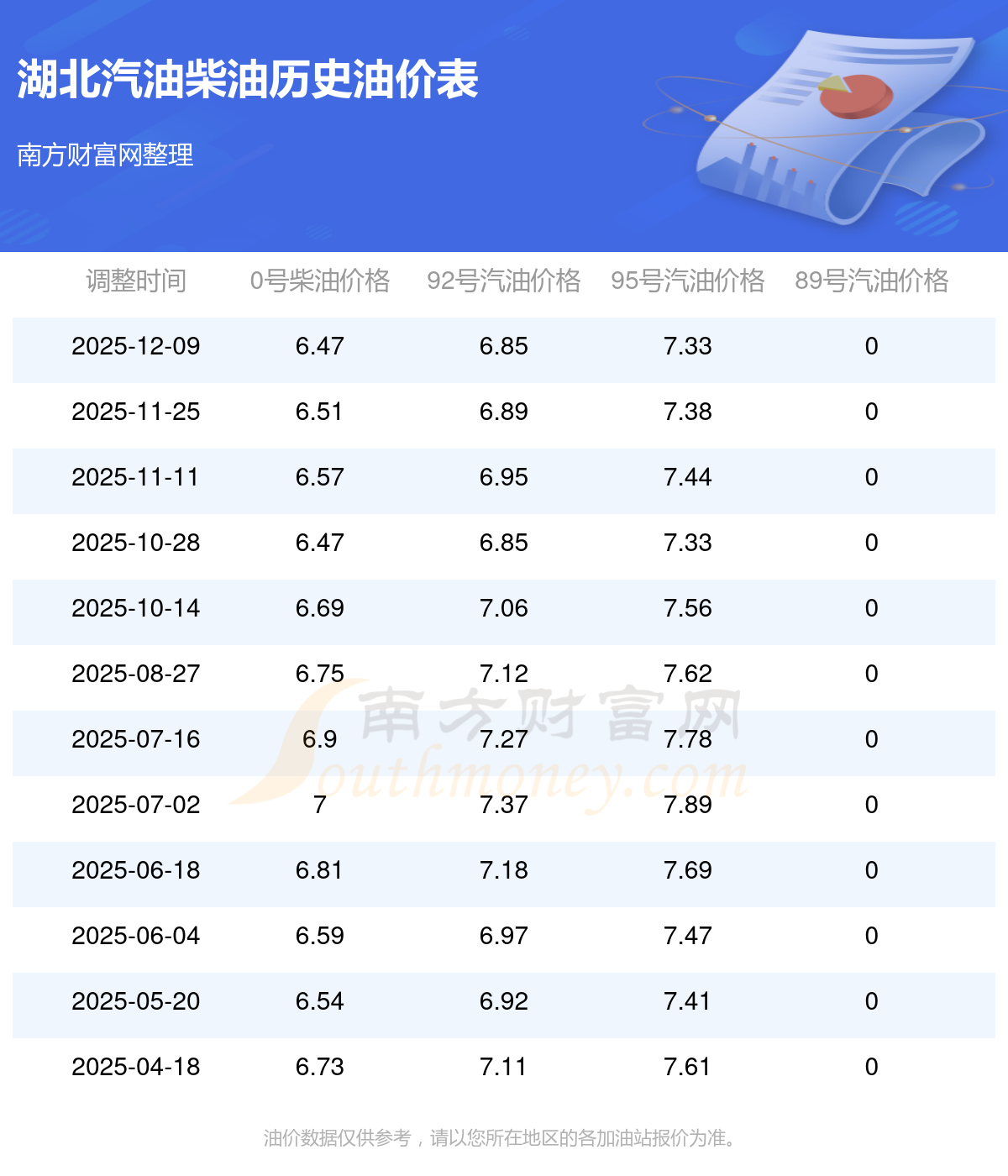 12月14日湖北0号柴油的价格是12月9日调整后的价格,具体是6.47元/升,本轮湖北0号柴油油价跌了0.04元。