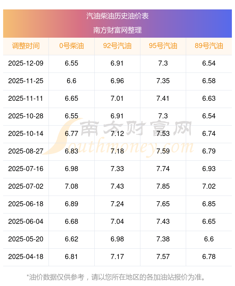 12月14日南岸95号汽油的价格是12月9日调整后的价格,具体为7.3元/升,对比上次调整时间11月25日的油价7.35元每升,减了0.05元,减幅达0.68%。下一轮油价调整时间12月22日24时,距离现在还有8.38天。