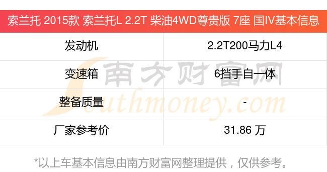索兰托 2015款 索兰托L 2.2T 柴油4WD尊贵版 7座 国IV动力上搭载的是一台2.2T200马力L4涡轮增压发动机,匹配6挡手自一体自动档变速箱,燃料形式为柴油,厂家参考价31.86万元。